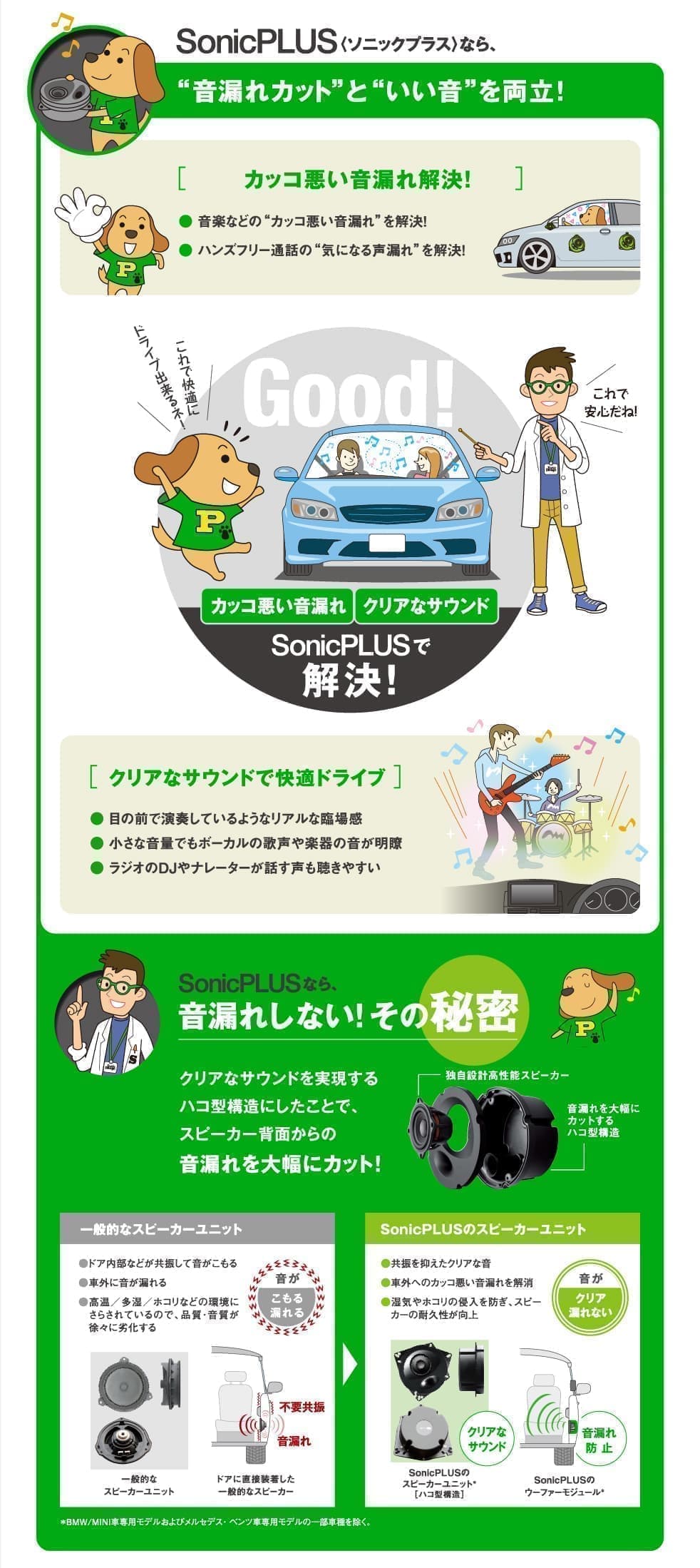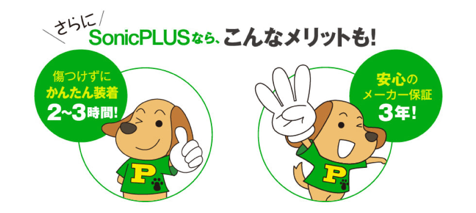 ドライブにかかせない音楽やラジオの音、そしてハンズフリー通話も、実は車外に漏れていることを知っていますか?SonicPLUS <ソニックプラス> なら、ソニックデザインの独自の技術でクリアなサウンドを実現しながら車外への音漏れを大幅カット!「漏れなく、いい音」で快適なドライブを楽しめます。